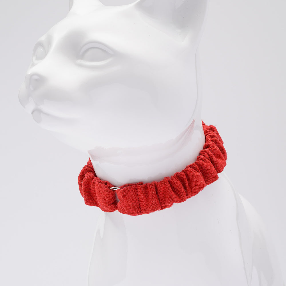 鮮やかな赤紅色が美しい、シンプルで上品なシュシュタイプの首輪です♪ 兵庫県西脇市産の高級シーチング生地を使用し、子供服にも使われるほど滑らかな肌ざわり。デリケートな猫ちゃんにも安心のつけ心地です。