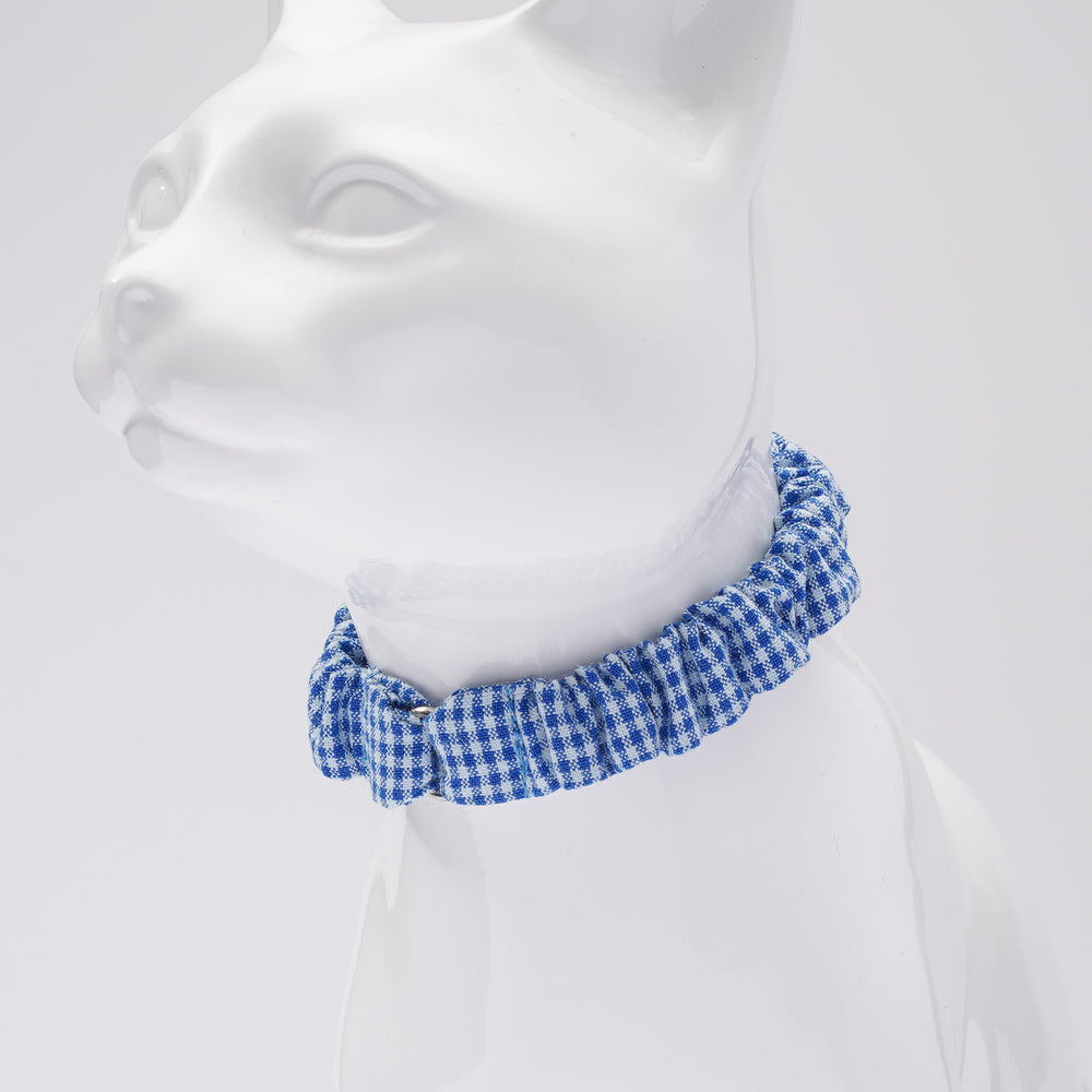 兵庫県西脇市で作られた国産生地を使用した肌や被毛に優しいギンガムチェックの猫首輪。ほどよい生地厚と滑らかな肌触りで猫ちゃんウットリです。
