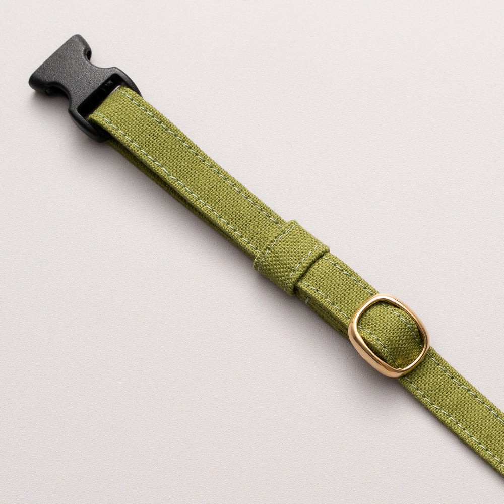 綿麻素材の高級素材でできた猫首輪です。こだわり派の飼い主さんにおすすめです。吸湿性、保湿性、発色性に優れた綿(コットン)に、麻を織り交ぜて通気性を増した高級素材です。二つの天然繊維を混紡することにより、手入れがしやすく肌触りもとても優れています。