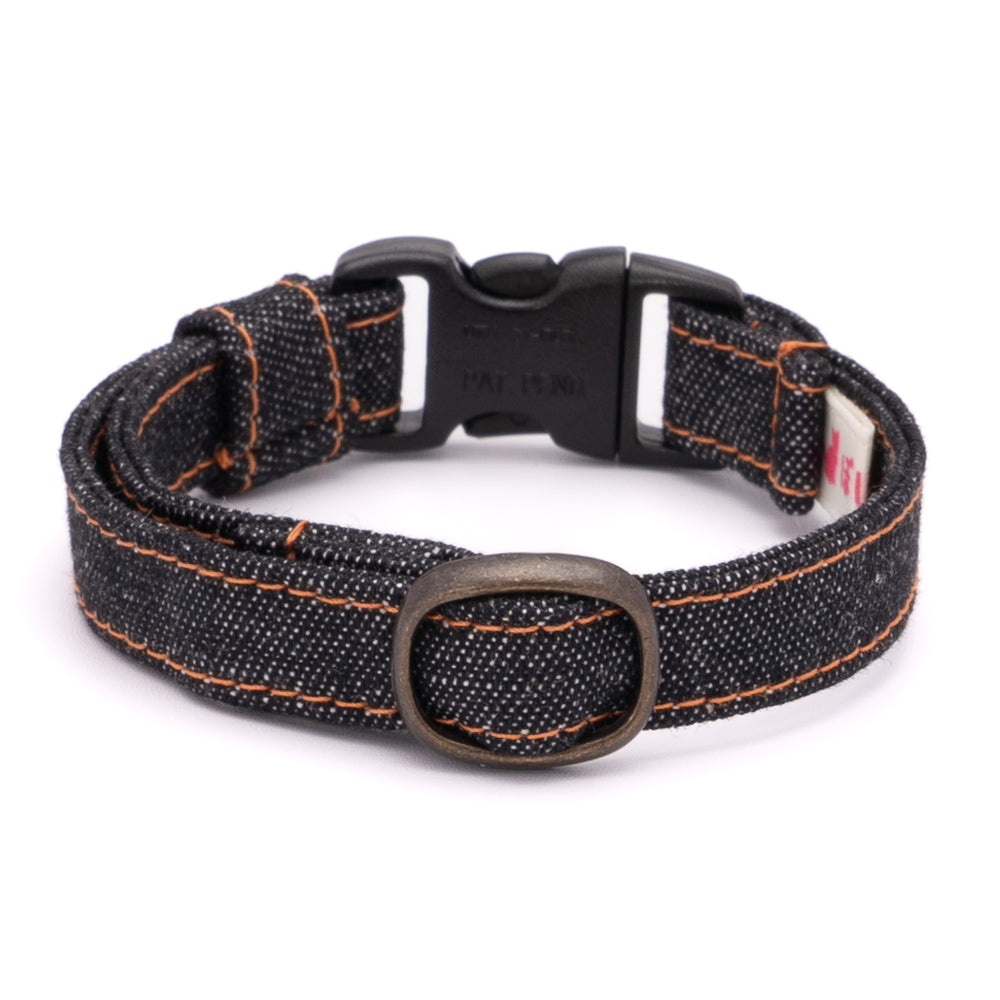 デニムの聖地として有名な岡山県倉敷市の児島地区で作られた、くったりやわらかな国産デニムを使用。インディゴ染めの本格デニムだけど優しい、オシャレ度満点の猫首輪です。