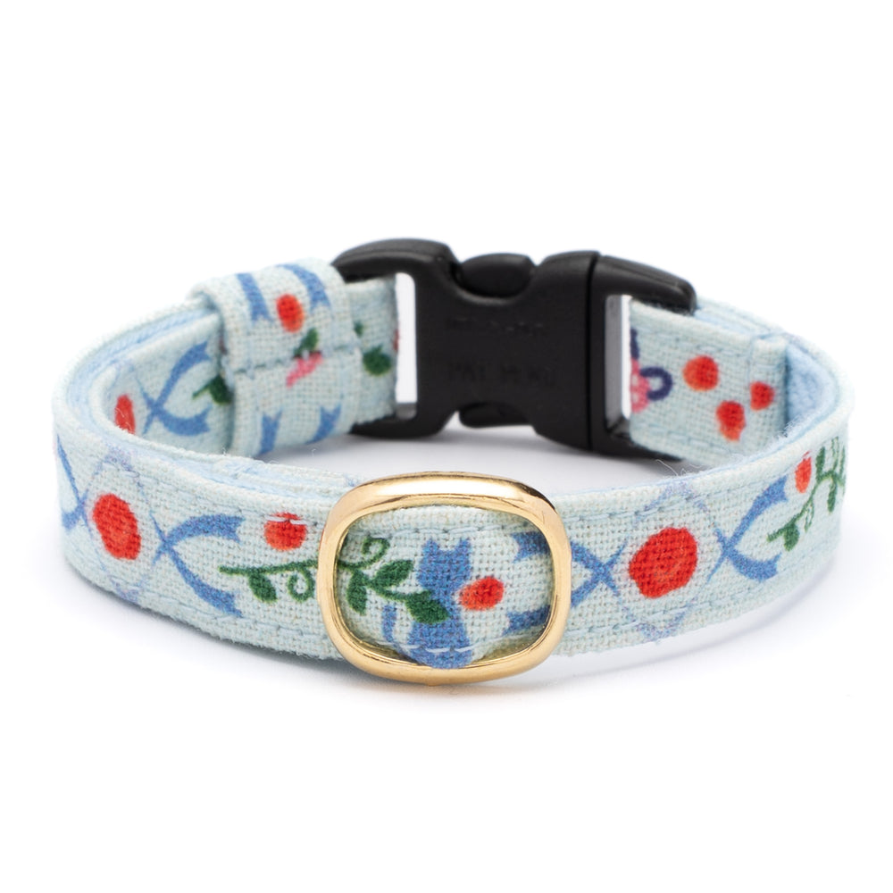 上品で華やかなバラの花を描いた、春らしい首輪です♪ さわやかなライトブルーをベースにした、エレガントで優しいデザイン。実はこっそり隠れ猫も…?探してみるのも楽しいですね♪