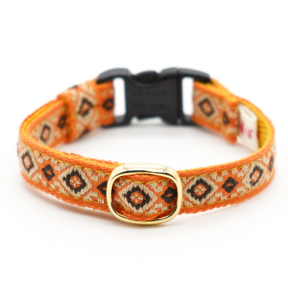 チロリアンテープを使ったおしゃれ&快適な猫首輪。ちょっとエスニックな織柄が素敵です。肌に触れる裏面はコットン100%の「杉綾リボン」を使っているから肌に優しい仕上がりです。