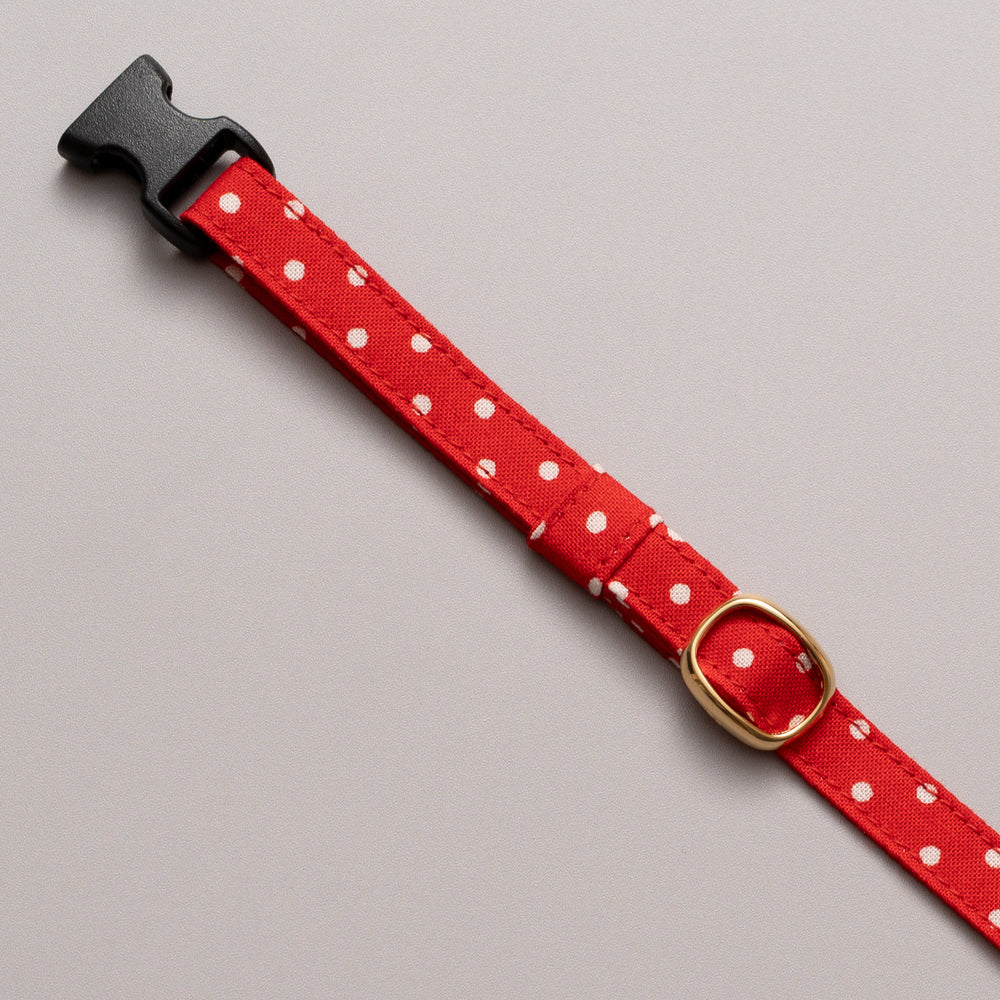 シンプルで飽きのこないドット柄が魅力の、ノーマルタイプの猫首輪です。柔らかなコットン100%素材を使用し、薄手で軽やかだから首への負担も少なく、子猫ちゃんからシニア猫ちゃんまで安心してご使用いただけます。毎日つけても嫌がりにくいやさしい着け心地で、猫ちゃんの肌に寄り添う仕上がりに。気分に合わせて選べる豊富なカラーバリエーションも嬉しいポイント。さりげないおしゃれを楽しみたい方におすすめです。