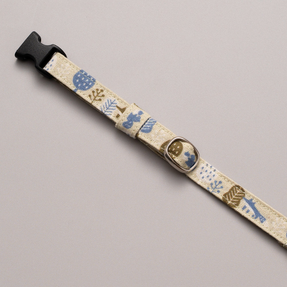北欧の秋を旅するような気分になれる首輪です。キツネとリスが森で実りの季節を楽しむ姿を、モダンな北欧風イラストで表現しました。裏面には柔らかな杉綾リボンを使い、首回りに優しい仕上がりに。木の実が落ちる音や落ち葉を踏む足音が聞こえてきそうな、温かみあふれるデザインです。
