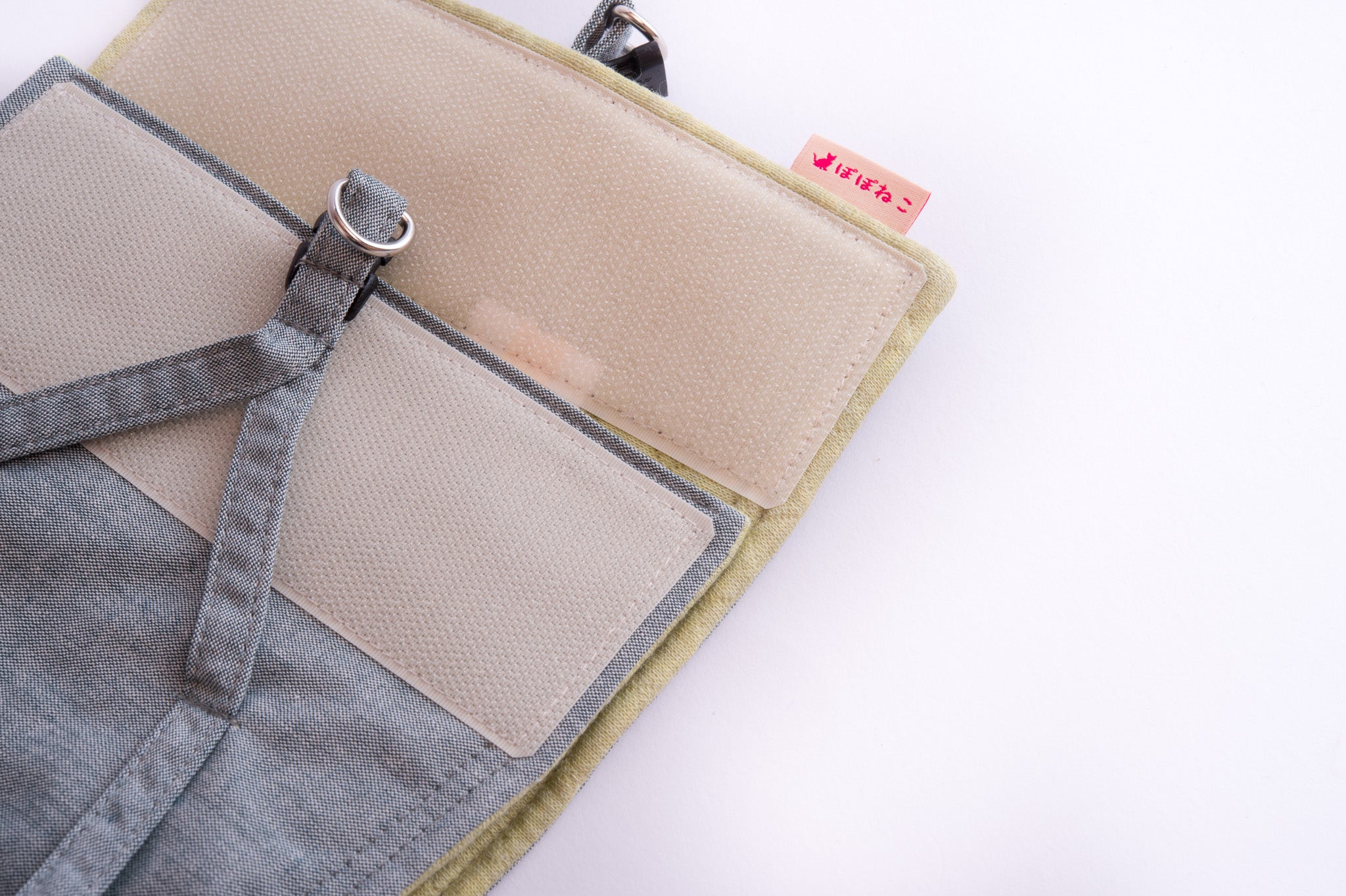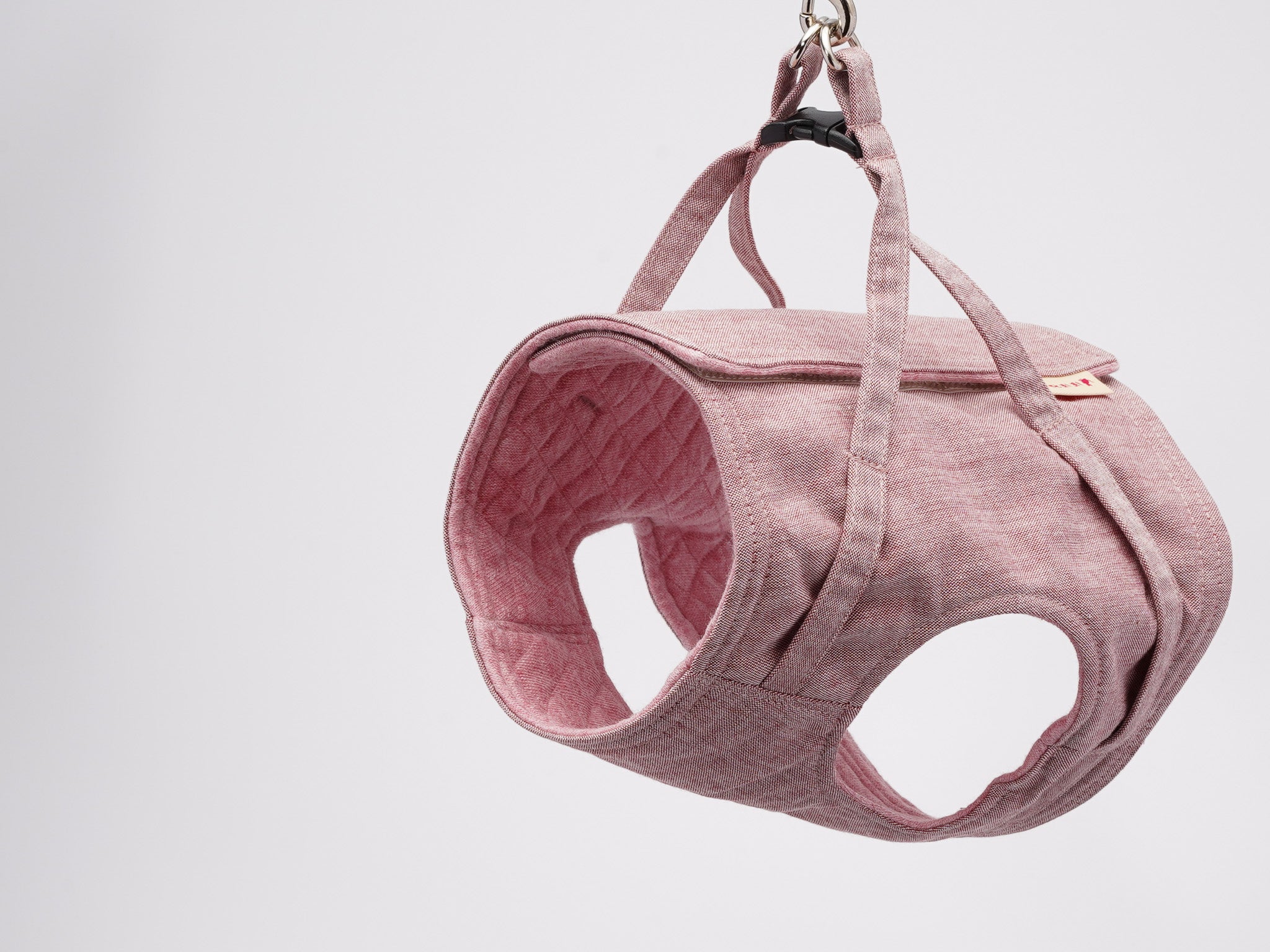 猫ちゃんの肌に触れる裏地は、うっとりするほど肌触りがいい国産のオーガニック・コットンを使用。被毛や皮膚への負担を少なくしています。クッション性のある生地なので、猫ちゃんの上半身を優しく、しっかりホールドします。