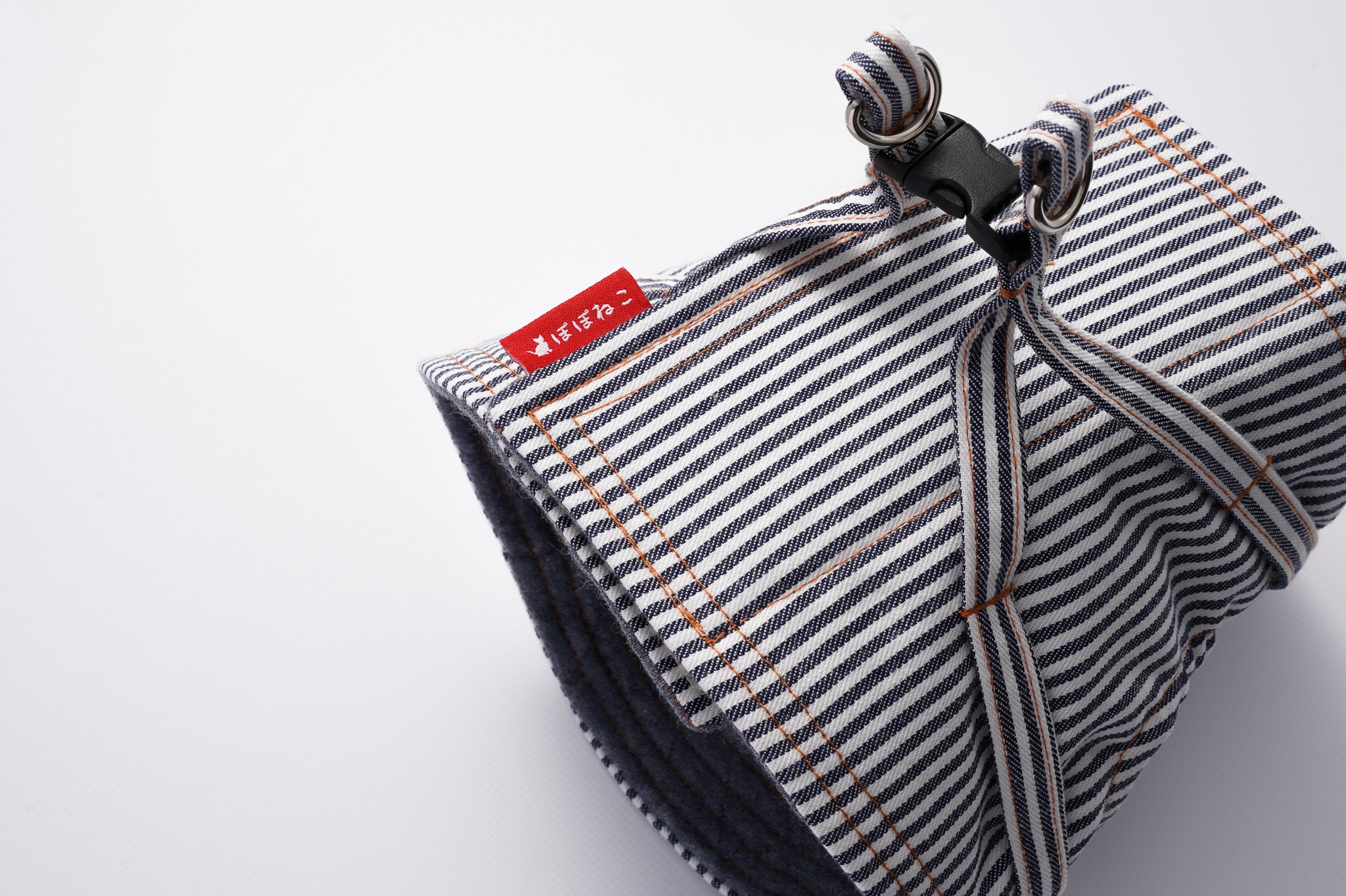 表地には汚れに強い国産の綿ポリダンガリー生地を使用しています。薄手でも適度なハリ感があるので、猫ちゃんの体型にぴったりフィット。軽くて動きやすいのが特徴です。