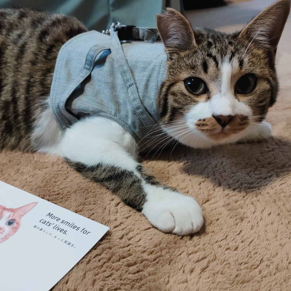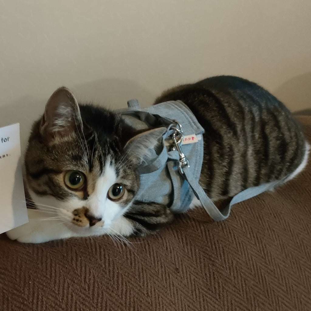 以前もつけたことがあったのですが、脱いでしまっていました。こちらのベスト型ハーネスだと、優しくしっかりホールドしてくれます。
