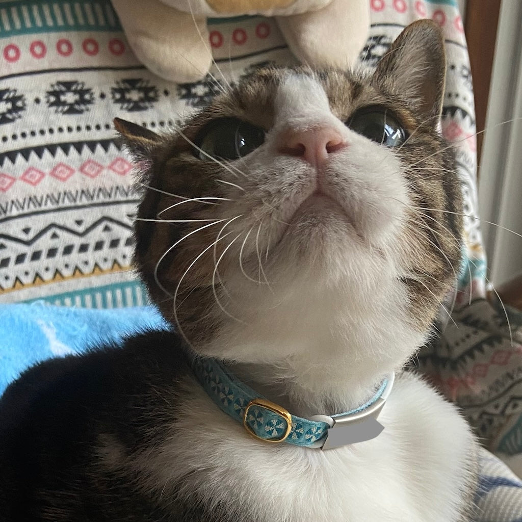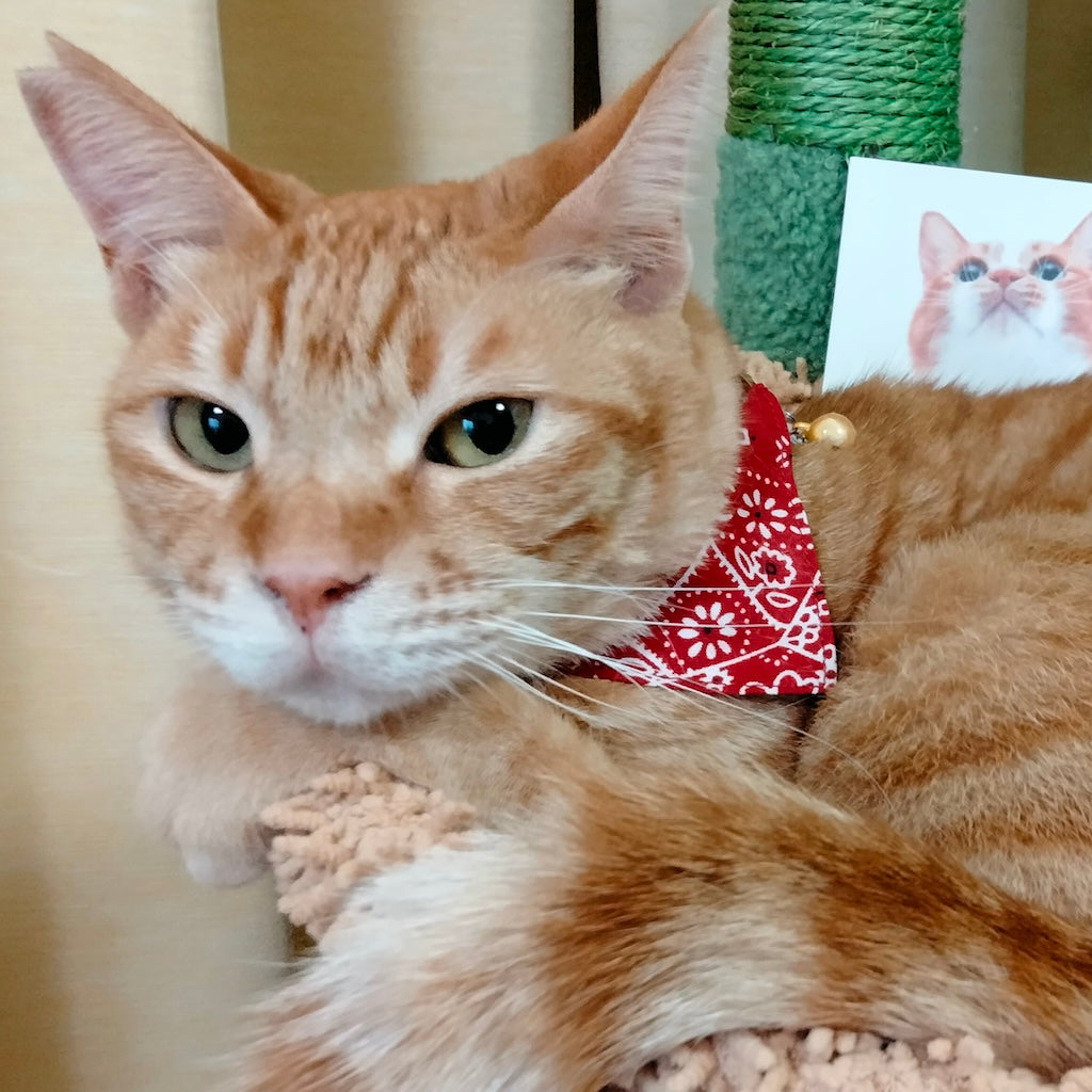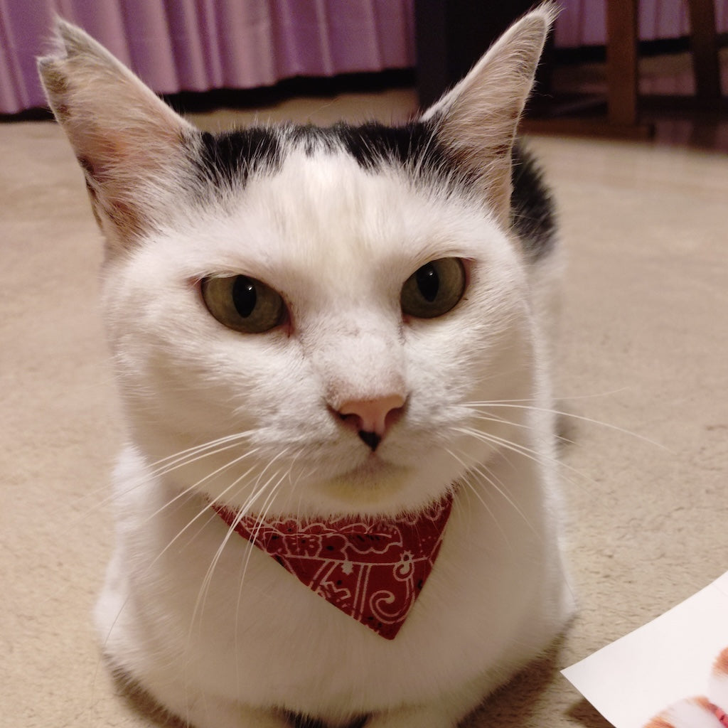 元々首輪を嫌がらない猫でしたが、市販の首輪のデザインがピンと来ず、使用していませんでした。しかし、ぽぽねこではたくさんのデザイン、形状があって、見ているだけでも楽しめます!バンダナ付きの首輪に一目惚れし、購入。三角の部分が背中にまわっている時もありますが、ずっとつけてくれています。季節で変えるのも良いなと思いました。