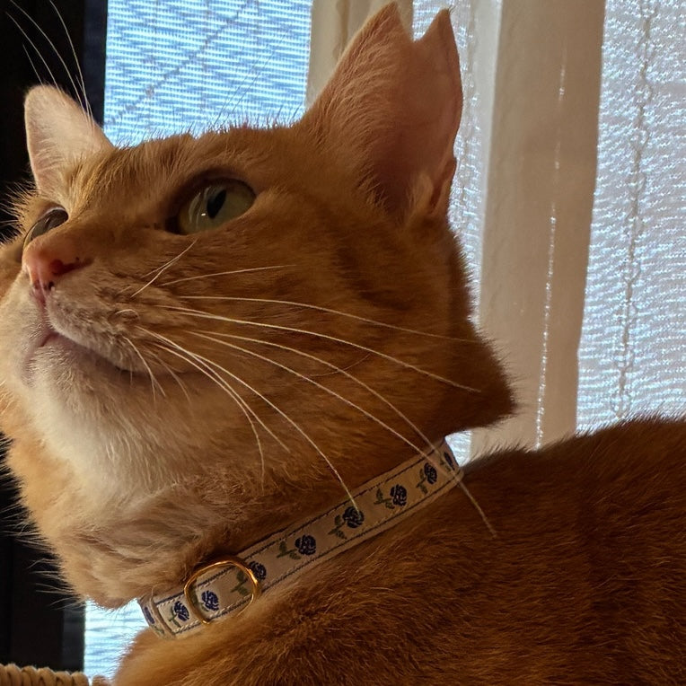 夏用に涼しげな色の首輪を探していました。白地に青いバラがとても素敵です。
