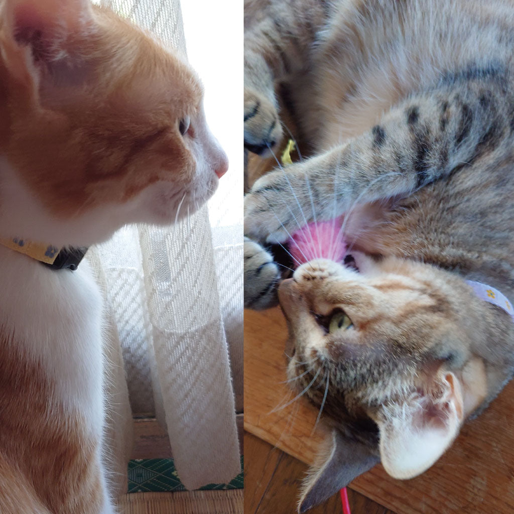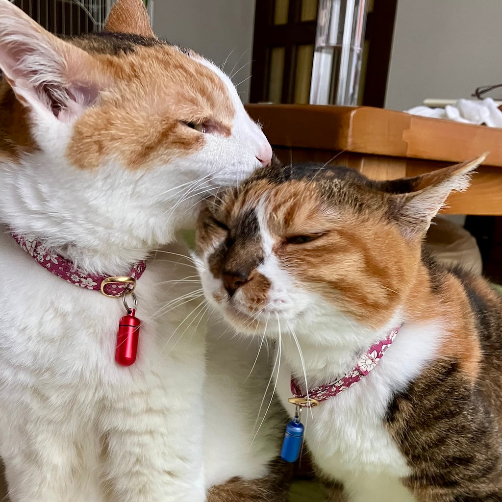 もう一匹の子が首輪ハゲになる子なので、この子もこちらで購入しました。ぽぽねこさんの首輪は軽いので猫ちゃん達も首輪をひっかいたりせず快適そうです。