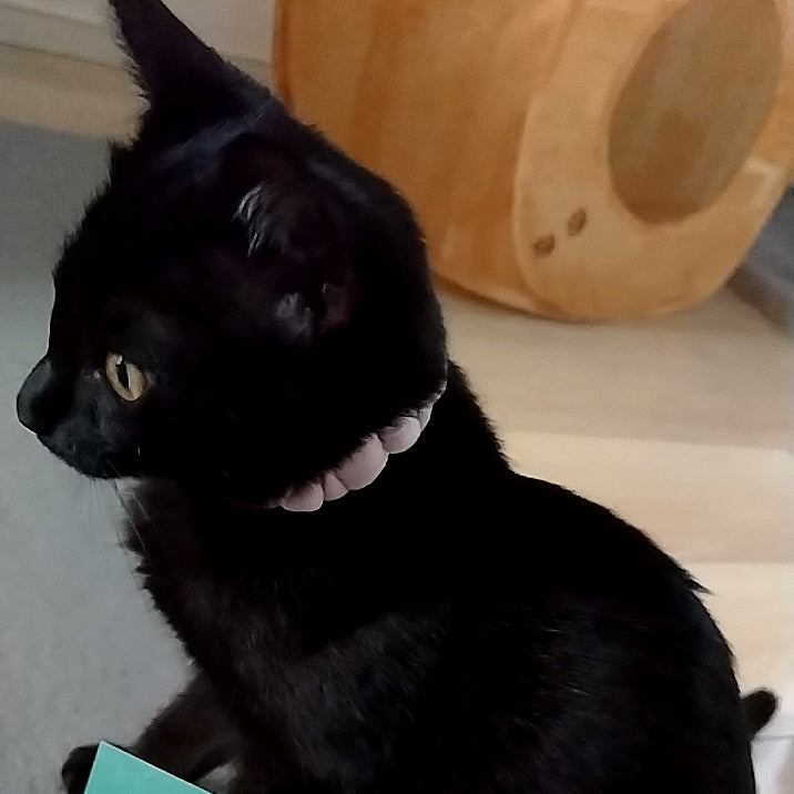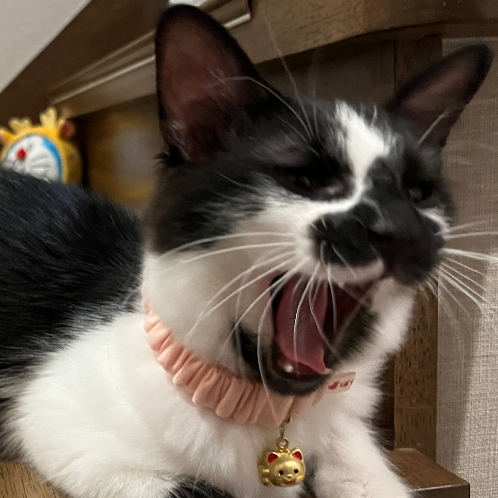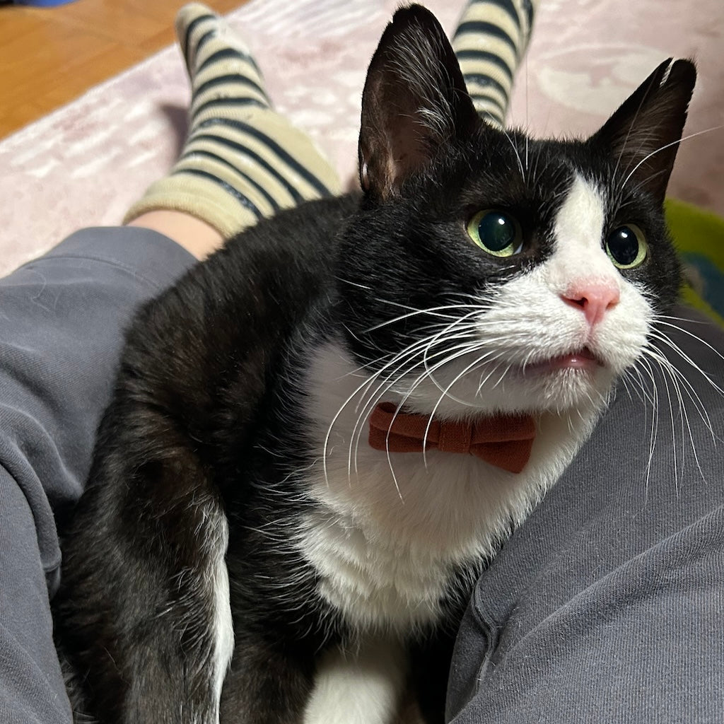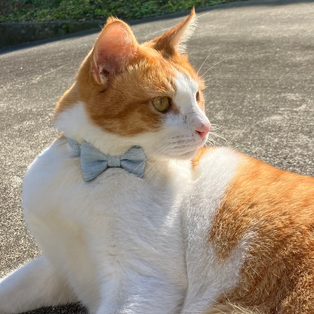 真っ赤ではなく、ぱっと明るくなる色味に、「絶対に白黒に似合う!」と思い、選びました。今年6月にうちの畑に現れ、保護しました。保護時に首に怪我をしており、いまだに毛が生え揃っていないため、負担にならない優しい生地のものを探していて、ぽぽねこさんの商品に辿り着きました。予想通り、白黒柄にこのカラーのおリボンはまさにタキシード猫!とっても似合っているねと、ピアノの生徒たちからも大好評です。