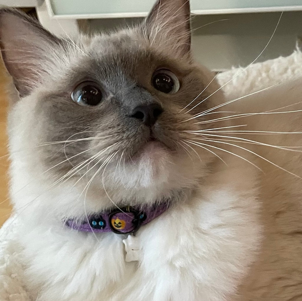 ノワちゃんの毛色に映えるパープル系のハロウィン🎃の首輪と猫のチャーム、迷子札をつけました❣️いやがらずつけていて、とっても似合っています😸ありがとうございました😊