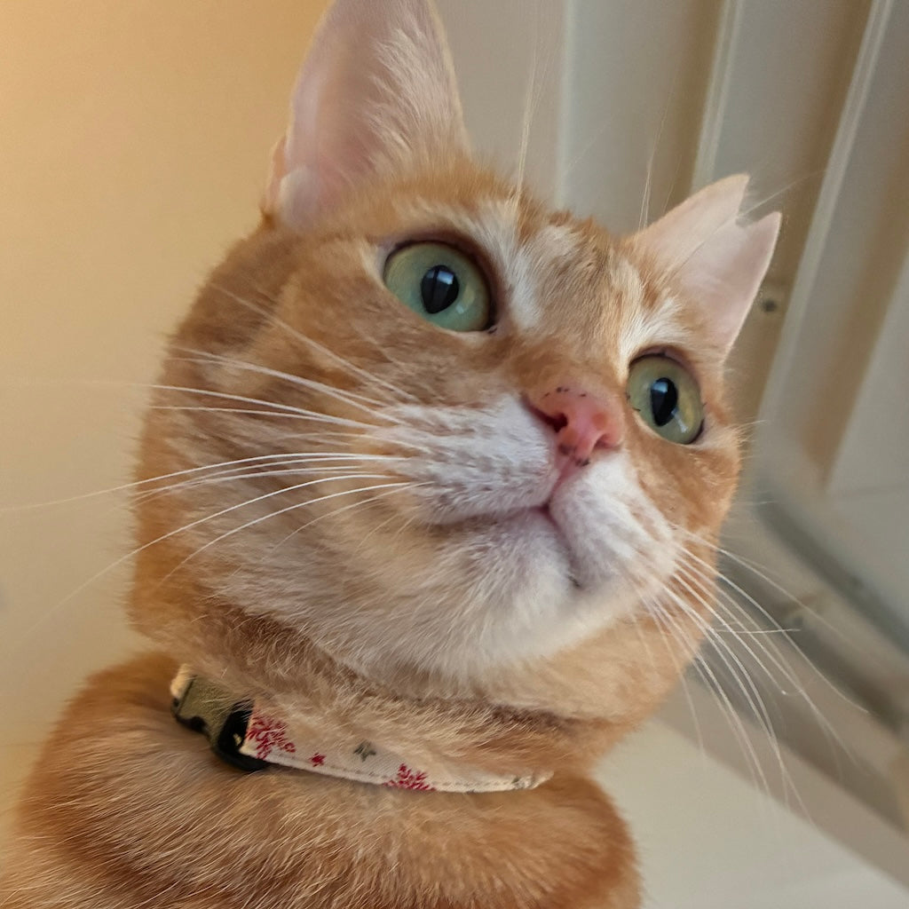茶トラ6ヶ月のメス。おしゃれで猫に優しい物を探していてこちらの商品を購入。大きめだったので少し縫って調整。シュシュタイプは初めてでしたがすぐに慣れてくれました!満足しています!